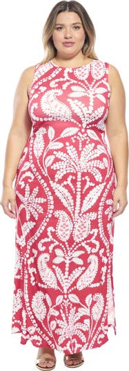 Refresh your summer style with this plus size red paisley sleeveless maxi dress from 24seven Comfort Apparel, blending floral and geometric patterns for bold appeal. A round neckline, fitted silhouette, and side slit offer flattering comfort. Soft stretch fabric is machine washable and tumble dry. Add wedges and a light accessory for an effortlessly polished look.