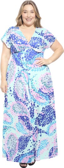 Elevate your wardrobe with the 24seven Comfort Apparel plus size blue abstract print womens maxi dress, where formal elegance meets all day comfort. Featuring a flattering V neckline, V cut back, cap sleeves, and a defined empire waist, the flared A line full length skirt creates a graceful silhouette. Crafted from soft, stretchy fabric, it is machine washable for easy care, perfect for special occasions or a standout date night look.
