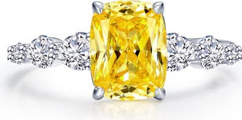A cushion-cut canary simulated diamond centers the pavé band of this polished ring that brings fiery sparkle to your hand.