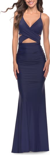 Long soft jersey dress featuring a criss cross bodice with cut outs. Open back with lace up straps and ruching along the zipper. Back zipper closure.