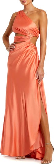 This elegant satin gown features a sleek one-shoulder design with a chic cut-out detail, creating a sophisticated look perfect for formal events and special occasions.