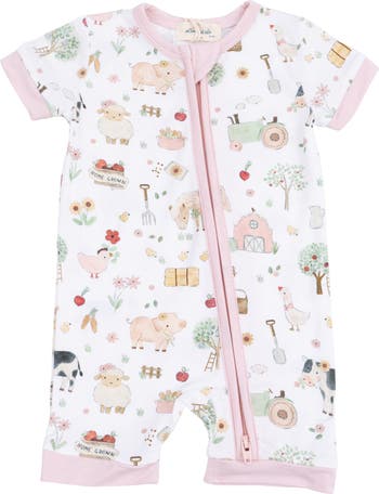 Cut farm animals bring abundant charm to a soft, stretchy footie made with short sleeves and a lined two-way zip for easy changes.