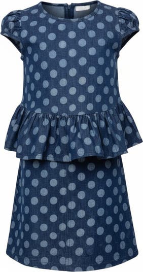 - Features a short sleeve denim peplum top with puff shoulders and an adorable flounce hem, decorated in playful white polka dots
