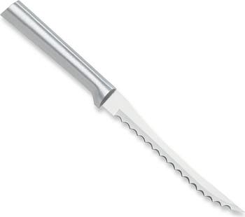 The Rada Cutlery 5-Inch Tomato Slicer is built for slicing tomatoes and other soft fruits and vegetables with precision. The serrated stainless steel blade grips delicate skins and cuts cleanly without crushing. Made in the USA from T420 high-carbon stainless steel, the blade delivers durability and long-lasting edge retention. Lightweight and easy to handle, this knife is ideal for sandwiches, salads, and everyday fresh prep tasks.