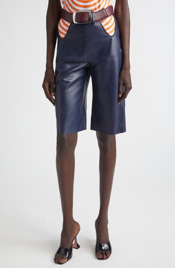 Dutch designer Duran Lantink continues the punk spirit of Gaultier for spring '26 with these lambskin-leather Bermuda shorts fashioned with skin-baring cutouts, slim legs and a wavy belt that dips precariously front and back.