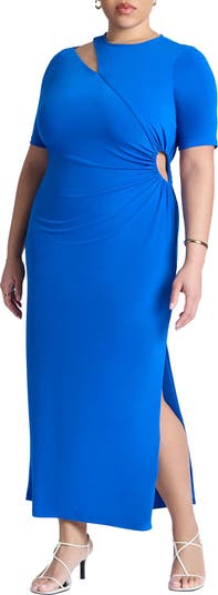A fully lined jersey maxi with jewel neckline and understated short sleeves.