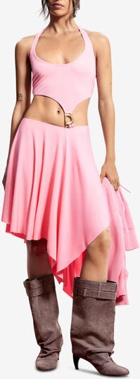 A drapey asymmetric skirt adds swingy movement to this halter dress made with an edgy waistline cutout.