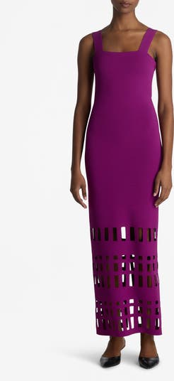Geometric cutouts imply a scaled-up plaid pattern from knee to hem on this fitted Milano-knit gown from the brand's prefall '24 collection.