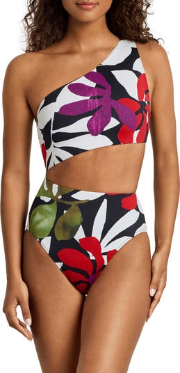Bring vacay-ready flair to your look with this vibrant one-piece swimsuit, featuring a breezy side cutout and a chic single bare shoulder.