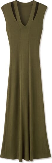 Cutouts frame the neck of this ultrasoft sweater-dress made with finely knit ribbing and a flared hem.