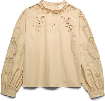 Long, fluted sleeves, ruffled trim at the neck and gorgeous cutout floral detailing add to the romance of this pure cotton blouse.