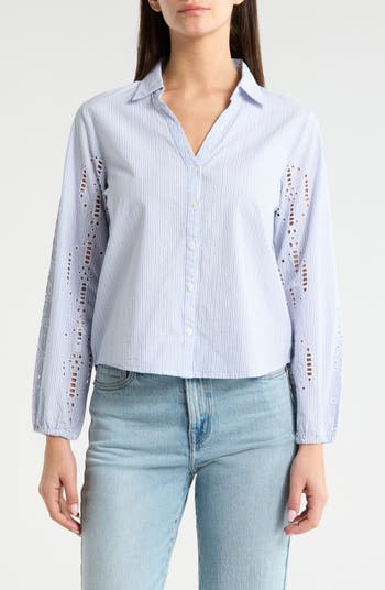 A striped staple shirt is so much sweeter with embroidered cutwork delicately defining the gathered sleeves.