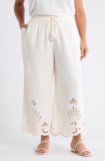 Cut from a lightweight linen blend, these summery tie-waist pants are punctuated with airy embroidery and sweet scalloped trim.