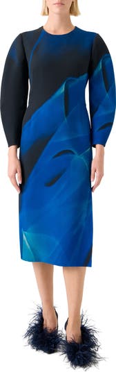 Capturing all the moods and hues of blue, and inspired by the work of Alyson Shotz, the featured print of the fall '25 collection illustrates this runway-showcased sheath dress framed with curved sleeves.