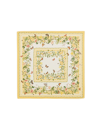 Step into a sunlit meadow with our Yellow Cybele Narrative Square Scarf. Crafted in soft twill, it blooms with cheerful pink and yellow flowers, capturing the charm of nature in full flourish. Mini cut fringes along the edges add a nostalgic touch.