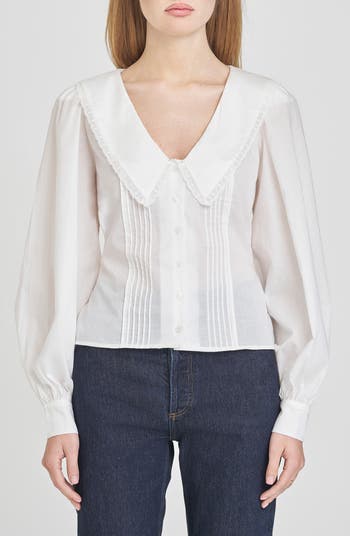 Sweeten your white cotton shirt selection with a lace-lilted option offered with petite pintuck pleats and shaped with a slim tie to cinch the back.