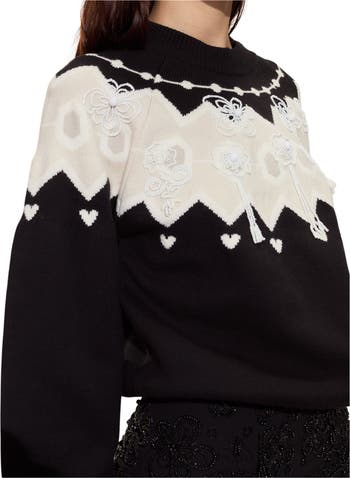 This sweater blends texture and detail through intricate seed bead embroidery and a detailed black and white geometric knit pattern.