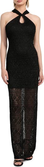 Sequins adorn the pointelle overlay of this curve-hugging maxi dress with a crisscros neck and a flirty keyhole.
