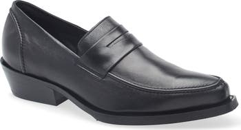 A narrow apron toe and angular stacked heel update a classic penny loafer made from soft Italian leather and set on a Vibram® sole.