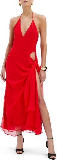 A geometric cutout and soaring side slit elevate the fierce energy of this fiery maxi, featuring an asymmetric, slinky silhouette secured by spaghetti-strap ties.