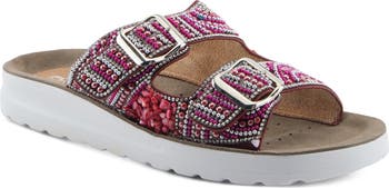 Glossy beads and lustrous embellishments add a dose of opulence to the buckled straps on a slide sandal grounded by a subtle platform and integrated wedge heel. An anatomic footbed and traction-enhanced sole deliver comfort and stability.
