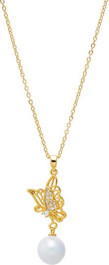 CZ Butterfly & Drop Pearl Pendant Necklace