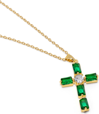 Gold-plated stainless steel cross pendant set with green and clear cubic zirconia stones on a rope chain. The cross symbolizes unity and peace, serving as a reminder of compassion, forgiveness, and love. Each piece is handcrafted and may vary slightly in size, shape, and color.