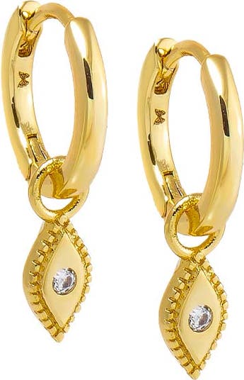 Turn heads with the bold CZ Evil Eye Drop Huggie Earring by Adina Eden. Textured, polished, and totally on-trend. Crafted to bring shimmer and personality to any look. Style it your way and glow all day.