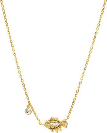 The CZ Fish Charm Necklace by Adina Eden adds a playful spark to your everyday Necklace lineup. Styled for shine and simplicity, this necklace for women is offered in Gold for daily wear. When comfort meets confidence, this effortless layer adapts to your mood, your outfit, and your pace—no questions asked. Stack this gold plated necklace with selections from the Lariat Necklaces collection to make your everyday styling effortless. Looks great now, and even better the second time around.