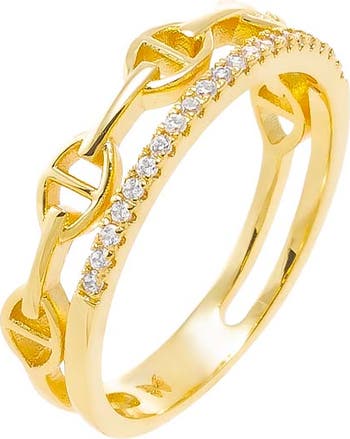 Elevate your style with Adina Eden's CZ Pavé X Solid Mariner Band Ring, crafted from durable brass and plated in luxurious 14K gold. This eye-catching ring features a unique mariner link design accented with sparkling clear CZ stones, creating a perfect blend of boldness and sophistication. With a sleek 5mm thickness and available in sizes 5 through 8, this versatile ring offers a comfortable fit for everyday wear or special occasions. Chic and contemporary, it's the perfect accessory to add a touch of glamour to any outfit.