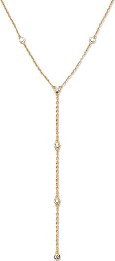 The only lariat in our current lineup, and she’s a standout. With a Y-shaped silhouette and bezel-set CZs that catch the light at every angle, this necklace adds an elegant shift in shape to your stack.