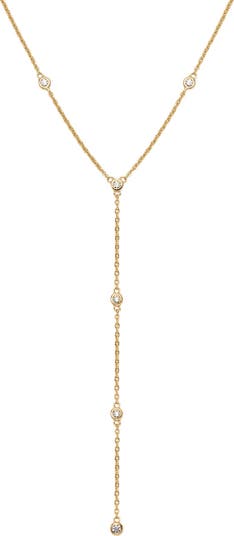 The only lariat in our current lineup, and she’s a standout. With a Y-shaped silhouette and bezel-set CZs that catch the light at every angle, this necklace adds an elegant shift in shape to your stack.