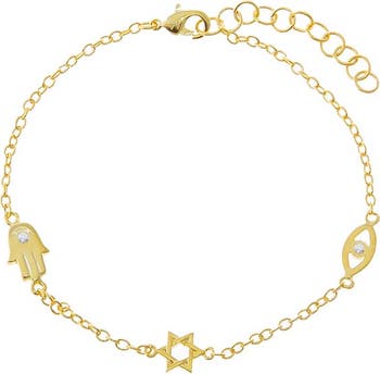 With a flawless silhouette, the CZ Protection Symbol Charm Bracelet by Adina Eden is the Bracelet you'll never want to take off. Subtle glam takes center stage in this gold plated bracelet for women, available in Gold. When you want your outfit to feel complete, it helps you feel confident and complete—like the final touch your look didn't know it needed. Complement this gold plated bracelet with selections from the Hand Chain Bracelets collection to add richness and depth to your vibe. You'll wear it now—and still love it when the season turns.