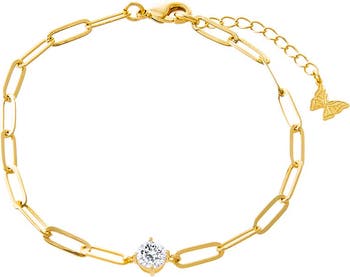 The Adina Eden CZ Solitaire Four Prong Paperclip Bracelet is a sophisticated piece, crafted from brass and plated in luxurious 14K gold. This bracelet features a single, brilliant 5mm clear CZ stone set in a classic four-prong setting, elegantly integrated into a modern paperclip chain design. Measuring 6.5" with a 1" extender, it provides a comfortable, adjustable fit that adds a touch of understated glamour to any look. Perfect for layering or wearing solo, this bracelet is a refined addition to any jewelry collection, combining timeless elegance with contemporary style.