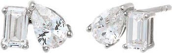 Gold-plated brass stud earrings with teardrop and baguette CZ stones. Size is 6x9 mm, with post back.