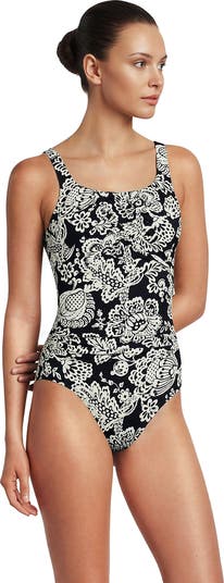 Swimsuit has slimming lines that benefit a woman’s figure. Material is form fitting and durable to hold up in the heat.
