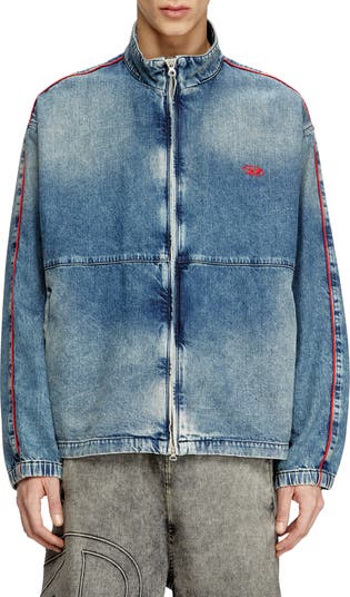 This rigid-denim jacket boasts a relaxed silhouette with dropped shoulders balanced by elastic cuffs. Side piping and signature logo embroidery in iconic Diesel red add unmistakable brand detail.