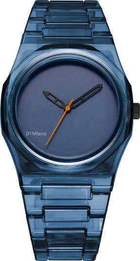 Make every second count when you wear this sleek, monochromatic nylon watch set with a translucent band and set off by an orange brass second hand sweeping the unmarked dial.