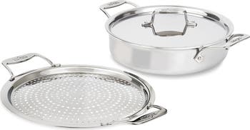 What it does: This kitchen-staple pan features a flat base and flared edges for drip-free pouring. The five-ply bonded construction has alternating layers of stainless steel and aluminum for warp-free durability and supremely even heating that eliminates hotspots.