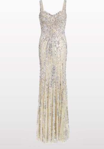 Delicate and captivating, this gown features a structured bodice with wide straps and a flattering sweetheart neckline. Its linear embellishment elongates the silhouette, flowing into a gently flared skirt. Perfect for grand celebrations and evening occasions.