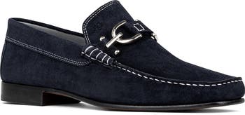 Polished bit hardware and a moc toe add visual intrigue to a supple suede loafer grounded by a cushioned footbed for comfortable wear.