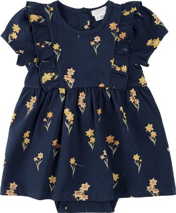 Darling daffs cover a skirted bodysuit made from stretch-enhanced organic-cotton jersey and accented with perky ruffles.