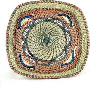 Beautiful Dahlia Basket is intricately woven of pine needles and pajón, a native wild grass, with colorful raffia accents. This sturdy pine needle basket may be decorative, but it's entirely functional too! Dahlia is a bold but elegant addition to your natural home decor or table setting. Designed and expertly handmade by El Triunfo, a democratically-organized group of Maya women artisans. Handmade in Guatemala Wild grass and pine needles 12" wide at top, 10" wide at base, 3.25" high