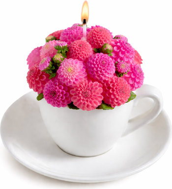 A dahlia bouquet aromatherapy candle in a teacup design, featuring hand-sculpted floral petals and a soft scented fragrance for elegant home décor and gifting. This pink orange dahlia candle is arranged to resemble a blooming bouquet, with warm-toned petals carefully sculpted and painted by hand. Set in a porcelain-style teacup and saucer, it adds a bright, cheerful floral accent to coffee tables, vanities or bedside spaces and makes a charming gift for any season.