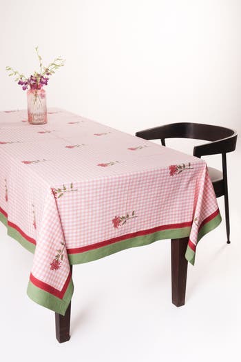 Dahlia lovers, unite! These showstoppers are a perennial favorite. Juxtaposed against a cheerful gingham, this tablecloth will be a perennial favorite. Expertly block-printed by an eighth generation family of artisans in Jaipur, the artisans are stewards of a craft that has been passed down to them generation after generation. From the master block makers who carve the blocks in a village to the hands that print the cloth, there are many hands that go into making each piece. By selecting this handmade piece, you contribute to reviving craft and supporting artisan communities. Thank you for supporting our artisans. Material: 100% Cotton Dimensions: 60" x 90" inches 70" x 120" inches