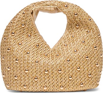 Polished dome studs bring sophisticated gleam to this woven raffia handbag fashioned in a slouchy, lightly structured silhouette.