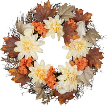 Hang up some serious style with this gorgeous 22-inch fall wreath! If your autumn decor could use a light, bright refresh, this piece is absolutely wreath-freshing! It moves beyond traditional colors with a sophisticated mix of soft peach and cheerful orange foliage, offering a welcoming, contemporary look. The unlit ring is densely packed with a variety of faux flowers and leaves in warm orange and cream tones, all accented with tiny pip berries and long, twisting twigs that form a substantial and eye-catching base. It’s a beautifully layered design that adds depth and dimension to any doorway or wall. This delightful autumn wreath is the quick and easy way to introduce a touch of floral elegance to your space. It's the ideal size for most doors or as a stunning focal point above a mantel. Since it comes ready-to-hang on its sturdy twig backing, you can instantly transform a tired area into a lively seasonal display. The varied materials give it a wonderfully full appearance, ensuring your fall decor looks abundant and inviting year after year. Stop leafing through old magazines for inspiration—this stylish fall wreath is the simple, pretty upgrade your home needs for a happy, cozy season of autumn decor! Product Features: Unlit Maple leaves, pip berry clusters, and twig foliage Large cream Dahlias, white roses, and small orange western wallflowers Sturdy natural grapevine twig backing for easy hanging - hanging hardware is not included No assembly required - wreath comes in 1 piece Recommended for indoor use - if using outdoors, place under a covered area Dimensions: 22" diameter (measured from outermost tip/edge to outermost tip/edge across the wreath) Inner ring dimensions: 8" diameter (approximately) Material(s): polyester/wire/plastic/twig Note: Branches are compressed for shipment, and need to be fluffed out upon arrival to look like the photo