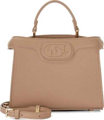 An embossed, monochromatic logo makes a signature statement on a structured faux-leather bag fashioned in a scaled-down profile and fitted with an optional crossbody strap for hands-free wear.