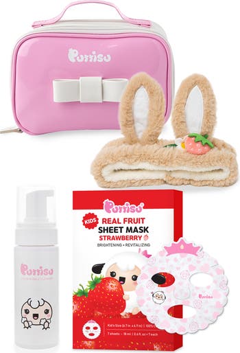 - How to Use Headband: Place the Spa Plush Headband around your hairline to keep hair comfortably in place during your skincare routine. Cleanse: Apply the Clean Bubble Cleanser to damp skin. Gently massage into the face to create a soft lather, then rinse thoroughly with warm water and pat dry. Facial Mask: Apply one Strawberry Facial Mask to clean, dry skin. Leave on for 10–15 minutes, then remove and lightly pat in any remaining essence until fully absorbed. Use 2–3 times per week for best results. Store: Keep all items neatly organized in the Beauty Girl Pouch for convenient daily use or travel.