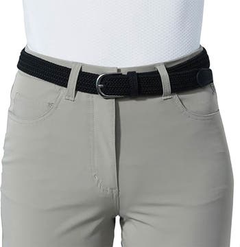 The Daily Sports Giselle Elastic Belt is a stylish and functional accessory designed to enhance your golf attire. Featuring a braided elastic design, it offers a comfortable stretch fit that moves with you on the course. The belt is accented with faux leather details and a silver-tone buckle embossed with the Daily Sports logo, adding a touch of elegance to your outfit.